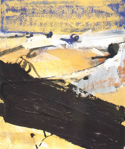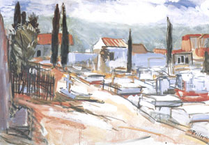 Landschafts- und Städtebilder, Er arbeitet mit Acryl auf Sackleinen,