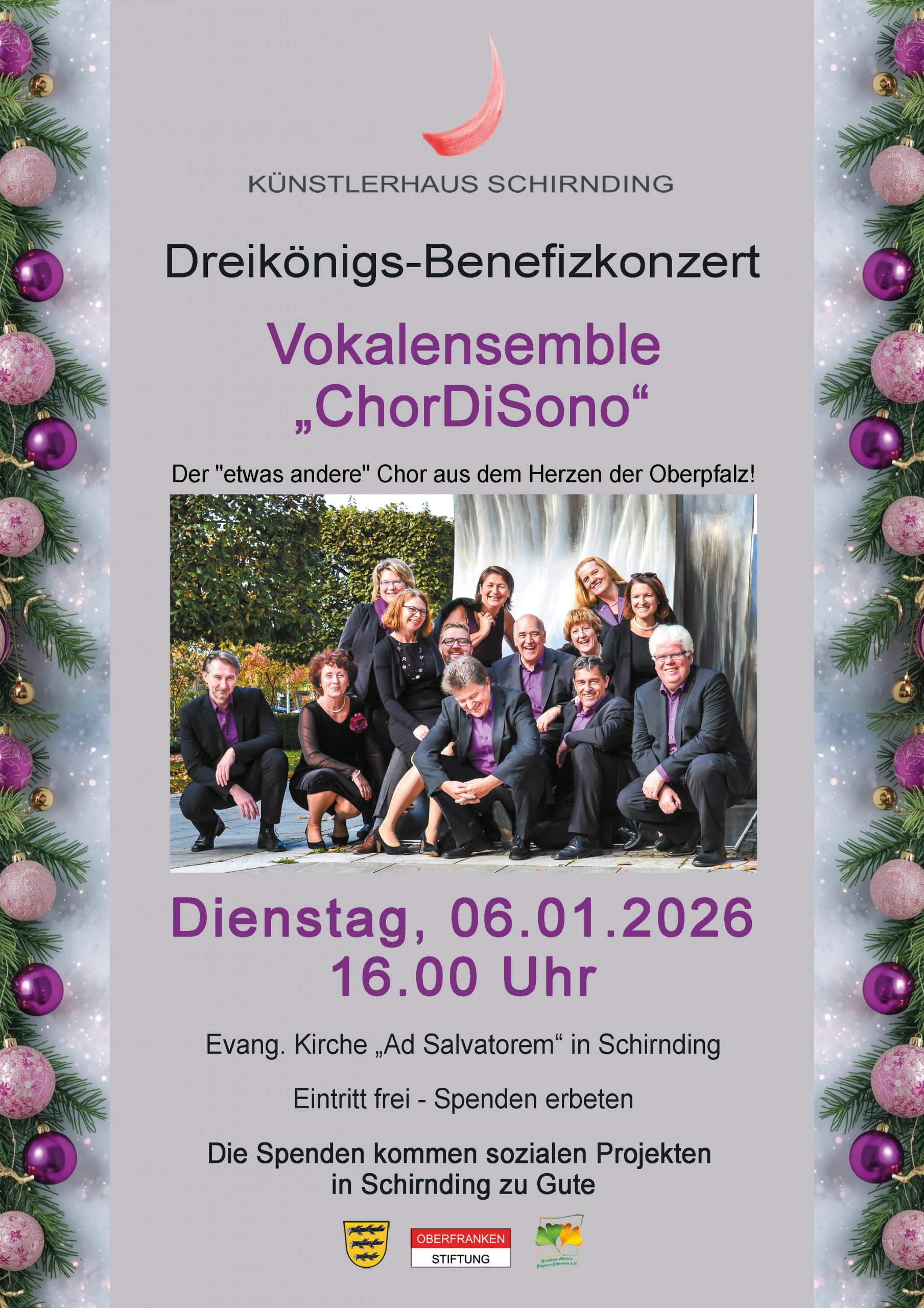 Am Dienstag, den 06. Januar 2026 um 16:00 Uhr erwartet alle Musikinteressierten in der evangelischen Kirche „Ad Salvatorem“ in Schirnding ein besonders musikalisches Highlight. Das Vokalensemble „ChorDiSono“ aus Weiden lädt zum Dreikönigs-Benefizkonzert zugunsten sozialer Projekte in Schirnding sehr herzlich ein.